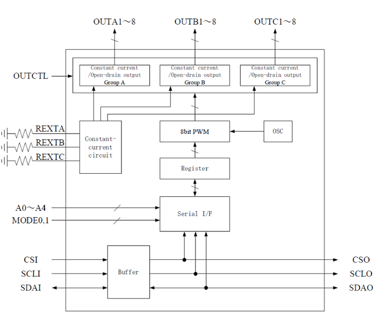 전기 장식용 LED 드라이버에 필수적인 기능으로는, 주소 지정이 가능한 시리얼 통신 을 통한 다양한 실시간 연출 등이 있다. 원하는 표시와 색상을 구현하기 위해서는 RGB 각각의 LED에 원하는 전류를 공급해야 하는데, LED에 공급되는 전류를 조정하기 위해 PWM 디밍 기능을 이용한다. 이 PWM 디밍 기능에는 넓은 다이내믹 레인지(공급 전류의 최대값과 최소값의 비율)와 세밀한 분해능, 높은 설정 정밀도가 요구된다.