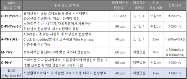 MIPI는 LVDS 등에서 채택하고 있는 저전압 진폭 차동 전송 기술을 사용해 높은 데이터 전송 속도를 구현하고 있다. 다만 주의해야 할 점이 있다. 데이터 전송 속도와 전송 방식을 규정하는 물리계층(PHY) 표준이 하나만 있는 것이 아니라는 점이다. 사실 MIPI라고 한 마디로 말해도 물리계층 표준은 여러 개가 존재한다.