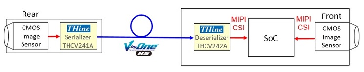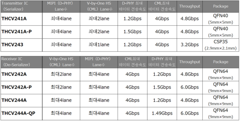 송신기 IC는 'THCV241A'와 'THCV241A-P', 'THCV243'의 세 가지 제품으로, THCV241A와 THCV241A-P는 모두 MIPI CSI-2 신호의 입력은 4레인, V-by-One HS 신호의 출력은 2레인이다. HS 신호의 최대 데이터 전송 속도는 4Gbit/s와 동일하지만, MIPI CSI-2 신호의 최대 데이터 전송 속도가 다르다: THCV241A는 최대 1.2Gbit/s, THCV241A-P는 최대 1.5Gbit/s이다. 패키지는 모두 5mm×5mm 크기의 QFN40으로, 실장 면적은 5mm×5mm이다.