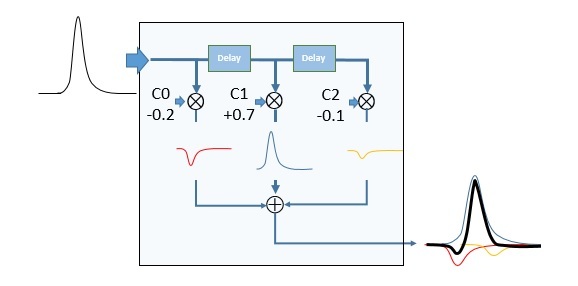 여기서, 각각의 기술을 간단히 설명하자. 트랜스미터에 사용되고 있는 FFE는 디엠퍼시스나 프리엠퍼시스의 기능을 포함하고 있어 실제로는 그보다 섬세한 파형 조정이 가능한 기술이다. 전송로에서 감쇠해 버리는 고주파 성분을 미리 송신단에서 증폭시켜 둔다. 구체적으로는 복수의 지연(Delay 블럭)으로 각 탭을 준비하고, 1UI(Unit Interval)마다 각 탭의 임의의 계수(비율)에서 증폭이나 감쇠시킨 신호를 ⊕부에서 서로 더하고, 출력하고 있다(Fig.4).