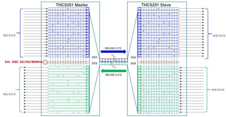 이 모드에서는, 외부로부터의 기준 클럭입력이 불필요합니다. 많은 비동기 신호입력을 오버 샘플링하여 시리얼라이즈⇒디시리얼라이즈 하여 출력합니다. 이것을 마스터⇒슬레이브, 슬레이브⇒마스터의 양방향으로 실시합니다.