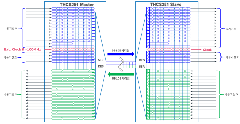 이 방법은, 외부에서 입력하는 기준신호로 구동하는 모드입니다. 화상신호의 기준클럭에 동기시킨 신호를 시리얼라이즈 하여 전송함과 동시에 제어신호나 센서의 피드백등과 같은 비동기신호도 이 기준 클럭에서 오버 샘플링 할수 있습니다. 화상신호와는 역방향의 비동기 신호도 동일하게 전송할수 있습니다. (그림5)외부 REF 입력주파수 범위는 9~100MHz입니다.