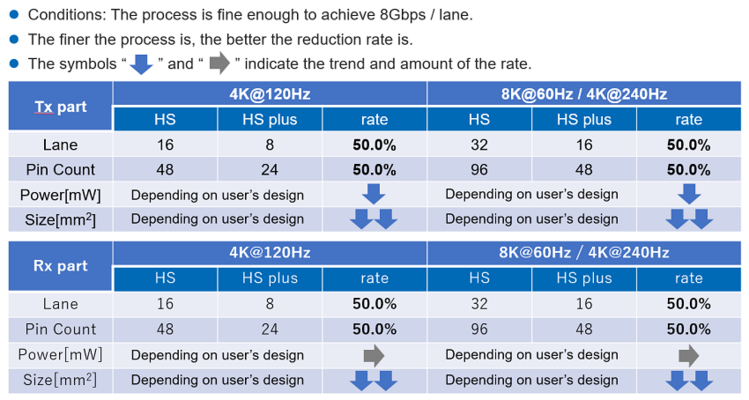 이를 통해 TV 제조사가 요구하는 영상의 고품질화와 저소비전력화에 모두 대응할 수 있게 된다. 구체적인 사례로 해상도는 4K, Refresh Rate는 120Hz인 TV를 기준으로 설명을 해보자. 영상 고품질화를 위해 4K 해상도의 120Hz TV에 HS plus 모드를 적용하면, 비디오 프로세서와 TCON을 연결하는 신호 라인의 레인 수는 그대로 유지하면서 8K 해상도의 60Hz TV나 4K 해상도의 240Hz TV로 업그레이드할 수 있다.
