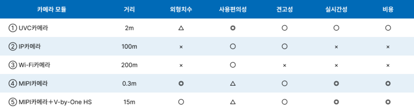 다만, 산업용 장비에 부착 할 경우, 영상처리 프로세서와 거리가 멀어질 수 있는데, MIPI 카메라 모듈의 전송 거리가 최대 30cm이므로, 거리 부족이 예상된다. 이 경우 고속 시리얼 인터페이스인 V-by-One HS를 조합하면 문제를 해결할 수 있다. 전송 거리를 약 15m까지 늘릴 수 있기 때문이다.