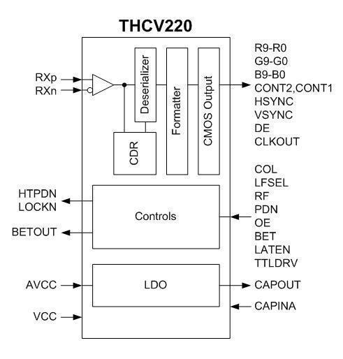 THCV220는 V-by-One®HS 신호를 32bit의 TTL/CMOS 신호로 변환하는 리시버 LSI입니다. 최대 실효속도 3.0Gbps의 V-by-One®HS 출력으로 720p/60Hz/30bit 컬러에 상당하는 영상신호 수신이 가능합니다.