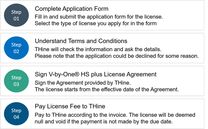 V-by-One® HS plusライセンスをご希望の場合は、ライセンス申請フォームより情報入力・送信をお願いします。ご提供された情報を確認のうえ、詳細情報をお伺いさせて戴きます。ご依頼のライセンス内容によってはご希望に沿えない場合もございますので予めご了承いただけますようお願いいたします。ライセンスは契約書の締結後に有効になります。契約締結後にザインエレクトロニクスからInvoiceが発行されますので、Invoiceにしたがってお支払いをお願いいたします。お支払期日までに入金が確認できない場合は、契約書の有効期限にかかわらず、ライセンス契約は無効・失効となります。