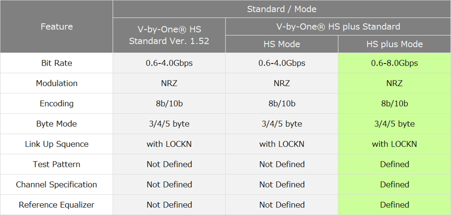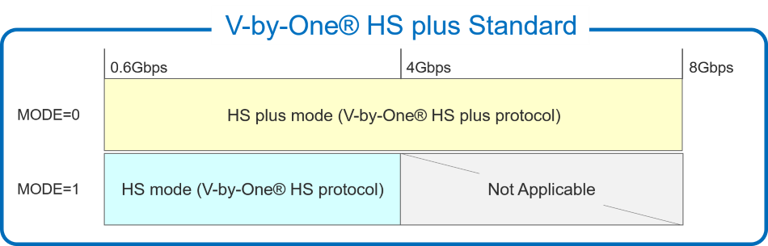 V-by-One® HS plus Standardは、2008年の発表以降、大型テレビ・パネル分野で広く使われているV-by-One® HSの最終バージョン、Ver.1.52を完全に包含します。V-by-One® HS plusは、従来のV-by-One® HSとの後方互換性を持つモードを「HS Mode」、および最大8Gbps/Laneでの伝送に対応する「HS plus Mode」の2モードを定義しています。それぞれのモードに互換性はなく、ユーザーはいずれかのモードもしくは両方のモードを実装・選択して使用します。