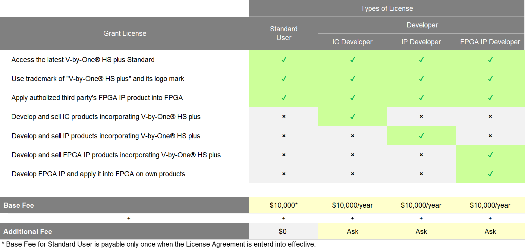 V-by-One® HS plus Standardに準拠したIC製品を開発・製造・販売するユーザー向けのライセンスです。Standard Userと同様の権利を包含します。V-by-One® HS plusに準拠したIP製品を自社のICに導入するユーザーもこのライセンス種別に該当します。ライセンス費用はBase Feeのほか、ユーザー毎に定義されるAdditional Feeにより構成されます。IP Developer