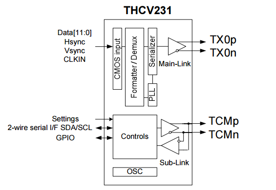 THCV231는 최대 12bit/pixel의 LVCMOS 패러럴 영상 신호를 시리얼 영상 신호로 변환하는 트랜스미터 IC입니다. 최대 실효 속도 2.24Gbps의 CML 시리얼 출력을 가지며, 1080p60Hz의 12bit 카메라 영상 신호를 Single twisted pair 케이블 또는 1개의 동축 케이블로 송신 가능합니다. 또한 양방향 통신 채널에 따른 I2C 호환 통신 브릿지도 가능합니다.