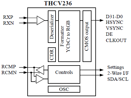 THCV236는 THCV 트랜스미터 IC에서 출력되는 시리얼 영상 신호를 최대 32bit/pixel의 LVCMOS 패러럴 영상 신호로 변환하는 리시버 IC입니다. 1080p60Hz의 16bit 카메라 영상 신호를 Single twisted pair 케이블 또는 1개의 동축 케이블로 수신 가능합니다. 또한 I2C, UART, GPIO 신호를 1개의 시리얼 신호로 통신 가능한 Sub-Link도 갖추고 있습니다.