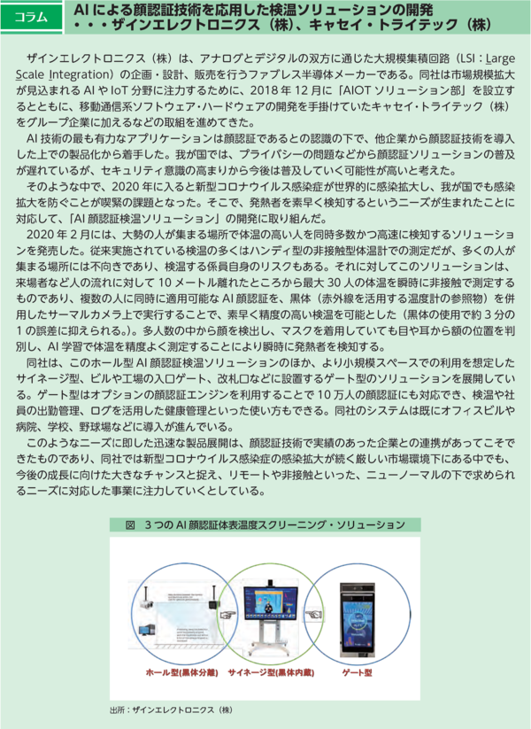 当社グループのAIによる顔認証技術を応用した検温ソリューションへの取組みは、世界最先端レベルAI企業とのエッジAI分野における従来の協業関係の上に、新型コロナウイルス感染予防に貢献するソリューションを付加することにより逸早く提供したものですが、今般、その取組と実績がニューノーマルに迅速に対応した事例として2021年版白書に掲載されたものと捉えております。