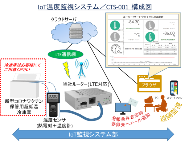 当社グループは、新型コロナワクチン保管状況をいつでも安心・安全に確認できるよう、ディープフリーザー(-75℃ または -20℃の冷凍庫)向け「IoT温度監視システム/CTS-001」の出荷を開始しました。本システムは、温度センサの測定値を、当社セルラールーターを介して遠隔地からクラウド経由で監視できるIoTシステムソリューションです。ユーザーは、PCやスマートフォンを使って、温度センサの測定値をいつでもどこからでもWebブラウザで確認できます。更に、ユーザー定義の発報条件と通知先メールアドレスをシステムに設定することで、例えば温度センサ出力値が発報温度条件値を上回った時点で、IoT温度監視システムは設定条件が発生したことをユーザーへ通知します。この機能により、ユーザーは温度センサ設置点からの距離に関係なく、適切なタイミングで温度異常を把握できます。その他、12時間おきの温度変化統計レポート機能を装備しています。