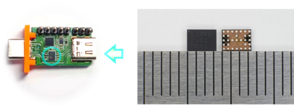 USB4アクティブケーブル用リドライバ(右写真)搭載エクステンダー(左写真)のサンプル