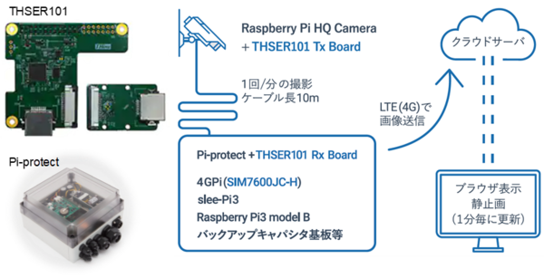 今回のコラボレーションでは、IoTソリューションとしても利便性の高いRaspberry Piを活用しつつ、カメラ映像の使い勝手を最大限引き出すため、当社によるRaspberry Piカメラ映像伝送距離を延長できるキット型ソリューションTHSER101と、メカトラックスによるRaspberry Pi防塵防水対応IoTゲートウェイ製品Pi-protectを用いることで実現しました。Pi-protectには、当社グループ企業が提供するLTE通信モジュールSIM7600JC-Hが搭載されています。