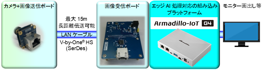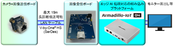 このMIPIカメラSerDesスターターキットは当社指定グラバーボードに接続すればノーコードでPCでの画像出力が可能となるほか、株式会社アットマークテクノ(本社:北海道札幌市北区、代表取締役 實吉智裕)のエッジAI処理対応の組み込みプラットフォーム「Armadillo-IoTゲートウェイ G4」に接続しても、実用的なサンプルコードでAI開発が可能になります(注2)。受信ボードの出力コネクタと提供するレジスタ推奨値を適応プラットフォーム向けにカスタマイズすることで、他のSoC(システム・オン・チップ)プロセッサやシングル・ボード・コンピュータ等との接続も可能です。