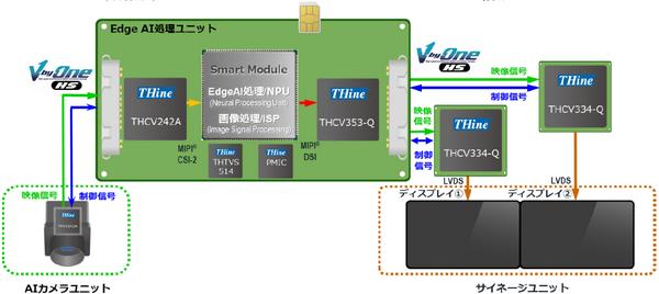 今回のAIサイネージ・ソリューションは、EdgeAI処理ユニット上に12 TOPS(注) のAI処理部 (NPU: Neural Processing Unit) を搭載することで属性認識を可能にするとともに、EdgeAI処理ユニットとカメラ・ディスプレイ間の映像信号・制御信号伝送を当社独自の高速インターフェースであるV-by-One®HS製品で接続することにより、高精細画像を数メートル間にわたり最少1ペアケーブルでの長距離伝送を可能といたしました。