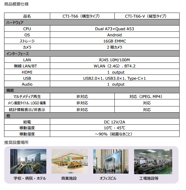 当社グループのキャセイ・トライテック株式会社では、学校や企業等の検温スクリーニングの利用場面で、同時に15 人の体温検出&マスク有無検出可能なサイネージ型AI 検温ソリューションを販売しておりますが、今回新たに新機種(CTI-T66 シリーズ)の提供を開始します。