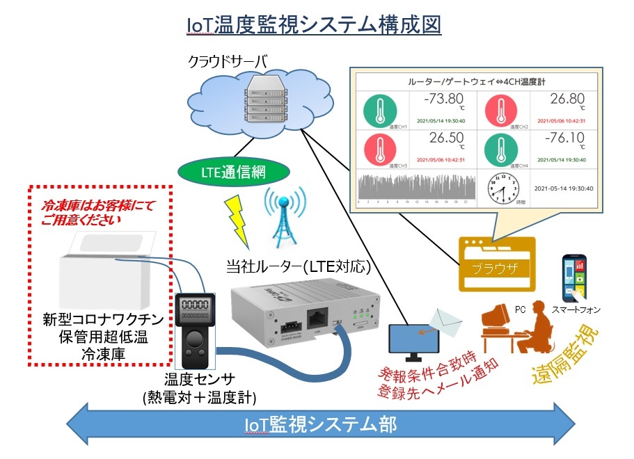 一定時間(30秒)ごとに冷凍庫内の温度情報をサーバにアップロードし、警報設定温度(例:ー65℃)を超えると自動的に関係者へ警報メールを発報します。