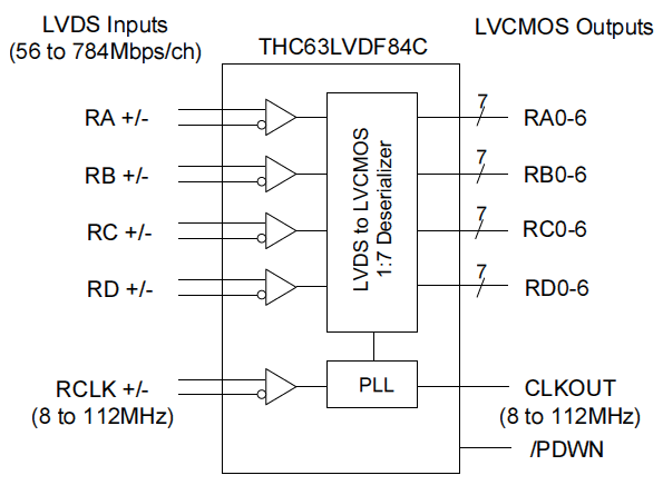 THC63LVDF84Cは8-112MHzの広範囲なピクセルクロックをサポートするLVDSレシーバICです。立下りエッジクロックを対応しており、中小型LCD、セキュリティカメラ、プリンタ複合機、タブレット等、様々なアプリケーションでお使いいただけます。