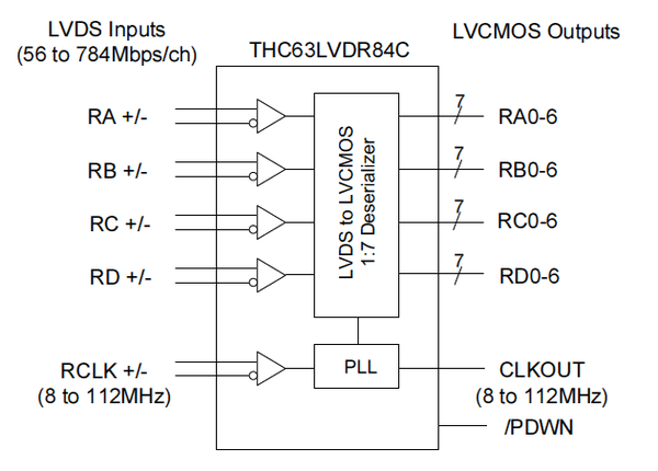 THC63LVDR84Cは、LVDSデータを24bit TTL/CMOSデータに変換するLVDSレシーバICです。立上がりエッジクロックを対応しており、中小型LCD、セキュリティカメラ、プリンタ複合機、タブレット等、様々なアプリケーションにお使いいただけます。