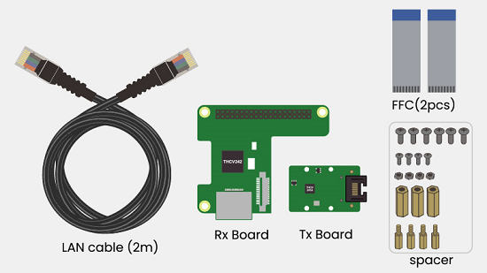 我们最先开发的就是远距离传输工具「Cable Extension Kit for Raspberry Pi Camera」(图1)。它能大幅度延长单板电脑「Raspberry Pi(树莓派)」与摄像头模组间连接的线缆的长度。该工具上装载了使用本公司的V-by-One® HS(*1)技术的传送器/接收器IC。