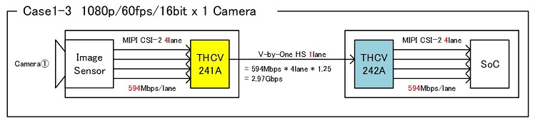 对这类用途来说,高速接口技术「V-by-One® HS」就是很有利的选择。通过将MIPI CSI-2信号转换成V-by-One HS信号后再进行信号传输,就能使传输距离延长到最长15m。这样就能满足需要电子设备厂商(客户)对「拍摄完成的影像信号的远距离传输」的要求。