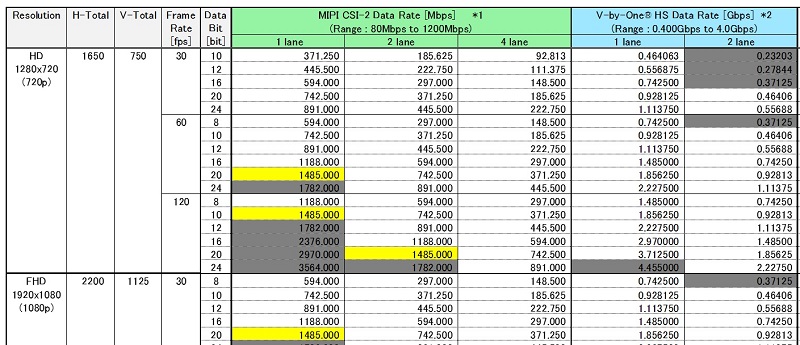 表中灰色部分是超出MIPI CSI-2或者V-by-One HS的数据传输速度范围外的案例,也就意味着组合后的传送IC与接收IC是无法对应的。而黄色部分是THCV241A与THCV242A无法对应;但THCV241A-P与THCV242A-P的组合就能对应的部分。因为THCV241A-P与THCV242A-P可对应的MIPI CSI-2的1lan最高数据传输速度高达1.5Gbps。而THCV241A与THCV242A则为1.2Gbps。