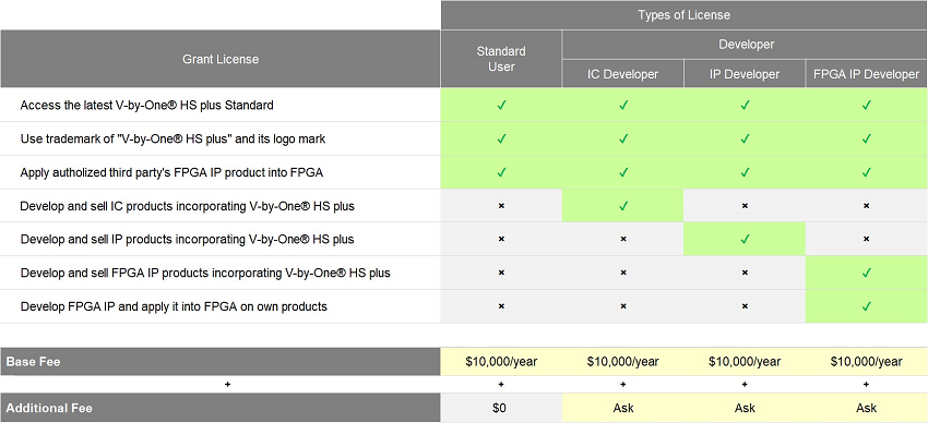 由于license类型与传统V-by-One HS规格相比有所变化,V-by-One HS plus用户承担的直接和间接的license费用可能会变大。但考虑到上述各部件的成本降低以及增加商品的高附加价值这两点,我们相信V-by-One HS plus将为每个license用户的成功作出贡献。
