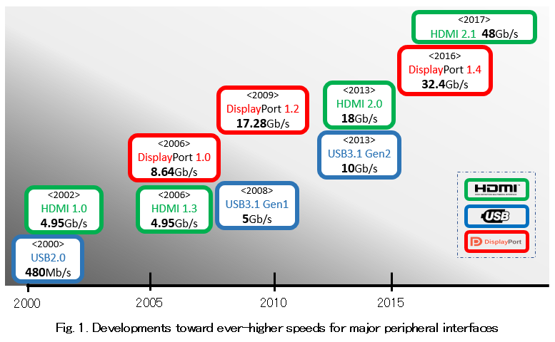此外,连接电脑本体和DVD/Blue-Ray Player・Recorder、机顶盒等影像播放器和Display、投影仪等的HDMI(High Definition Multimedia Interface)的高速化进程也正在加速中。2013年制定的HDMI 2.0规格规定的数据传送速度为18GB/秒(6 GB/秒x 3Lane);仅仅4年后的2017年,HDMI 2.1规格规定的数据传送速度已上升到48GB/秒(12 GB/秒x 4Lane)。