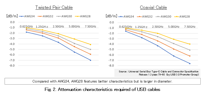是指每1m USB线缆的衰减特性。频率越高、线缆越细,衰减量就越大。AWG28的直径为0.32mm、AWG30的直径为0.25mm、AWG32的直径为0.2mm、AWG34的直径为0.16mm。(AWG是American Wire Gauge的略称)