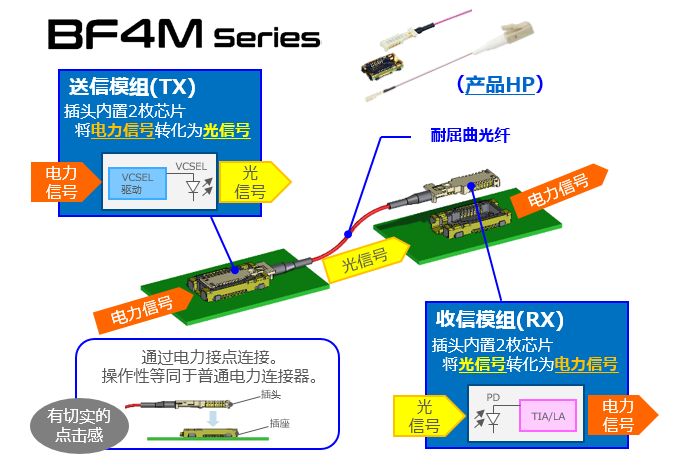 而实现上述构造的另一个关键部分就是广濑电机的光活性连接器:BF4M系列。如图5所示,是一种超小型AOC(*1):对应0.05~6.25Gbps、内置EO/OE单元的光活性连接器。