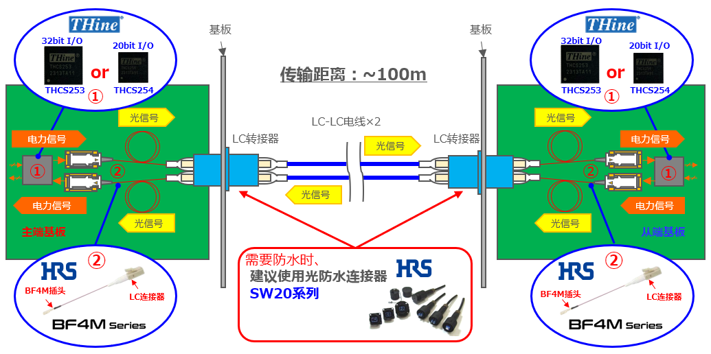 通过配套使用广濑电机能保证光的高速传输性能的光活性连接器「BF4M系列」、以及THine Electronics的适用于光纤化的高速数据传输用SerDes IC产品中的一款--串行收发器「THCS25x系列」,能在实现电力绝缘的同时大幅减少配线数;并能进行远距离的光纤传输。