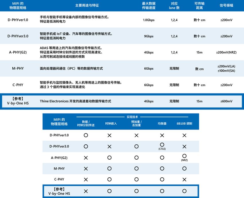 如前面所述,MIPI规格包含多个物理层规格。 例如,D-PHY ver1.0 目前升級为「D-PHY ver3.0」。 D-PHY ver3.0与D-PHY ver1.0一样采用差动传输的信号幅度与时钟分别传输的方式,但加入了去加重和均衡器的技术,使最大数据传输速度提升至每lane 9Gbit/秒。
