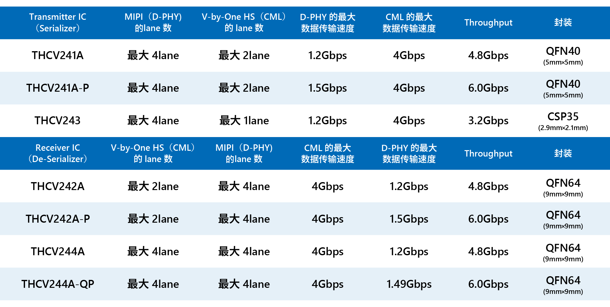 4款接收器IC则分别为「THCV242A」、「THCV242A-P」与「THCV244A」、「THCV244A-QP」。THCV242A与THCV242A-P的V-by-One HS信号输入均为2lane,MIPI CSI-2信号的输出均为4lane。V-by-One HS信号的最大数据传输速度均为4Gbit/秒,不同的是MIPI CSI-2信号的最大数据传输速度。THCV242A为最大1.2Gbit/秒,THCV242A-P则为最大1.5Gbit/秒。