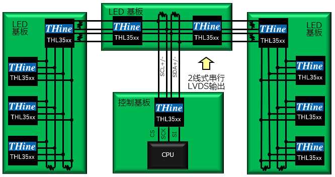 现有的THL3512/THL3514具有适用于串联方式或多点方式接口连接的特点。具体来说,它采用了2对LVDS接口(2线式串行LVDS)。由于LVDS采用差动传输方式,因此有着在抗共模干扰方面具有较高耐性这一显著的优点。