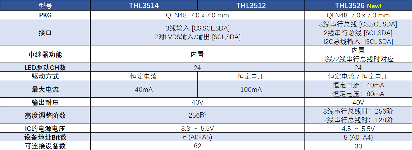 由此,本公司为了回应这些需求,扩充了电子装饰用LED驱动器的产品阵容。这次新推出的产品是「THL3526」(表1)。该产品不采用LVDS接口。LED驱动器之间的连接可以通过端子设定选择3线式串行接口(SPI)、2线式串行接口(SPI)或I2C接口。由于这些都是单端传输方式,因此不会增加配线数量。对于希望「避免印刷电路板上实装面积增加」的电子设备制造商来说,这无疑是最合适的产品。