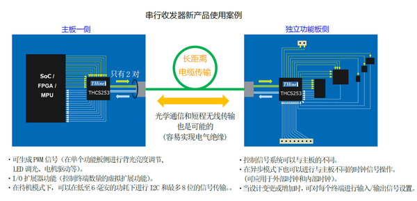 此外,THCS253/THCS254配备了 "异步模式",允许在数字接口转换中执行信号传输的印刷电路板之间以不同的时钟信号进行操作。它也适用于AI属性识别和图像识别的AI传感板和主单元控制板这样,不同电路板以不同的时钟信号进行操作的AI传感设备上。。;还可以在板卡之间高速双向传输图像和视频信号。除了支持外部提供的时钟信号外,这些信号还可以由安装在每块板上的THCS253或THCS254的内置时钟发生器电路提供,可以根据数字接口转换的特点灵活设置。