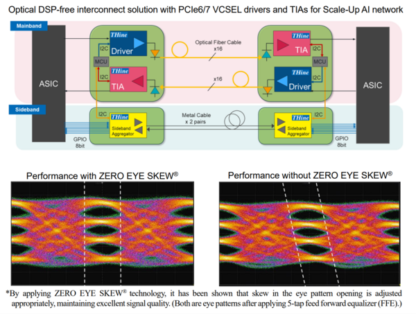 东京 --(美国商业资讯)-- 全球领先的无晶圆厂半导体供应商 THine Electronics, Inc.(东京证券交易所代码:6769,简称 “THine”)今日宣布,正式推出采用自主研发 ZERO EYE SKEW® 技术的无光学 DSP(数字信号处理器)芯片组。该解决方案专为 PCI Express 6/7(PCIe6/7)标准设计,适配线性可插拔光模块(LPO)或共封装光模块(CPO)的短距离光互联场景,尤其契合下一代Scale-Up型 AI 网络的 “Slow and Wide” 互联需求,可实现功耗节省 73%、延迟降低 90%,为 AI 服务器、超大规模数据中心提供高成本效益、高密度、高能效的互联新选择。