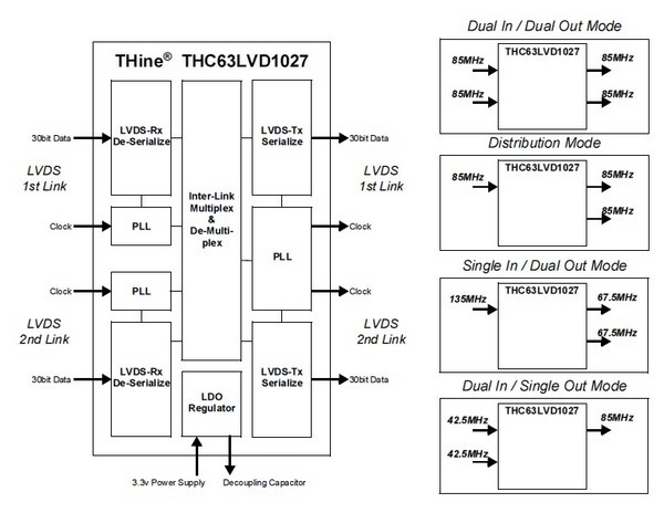 对应1080p/UXGA,作为信号波形整形/MUX-DEMUX/数据分配用途被开发的10bit Dual Link LVDS复制IC。LVDS I/F的SoC化改进且传送线路的延长被要求的时候,信号波形的质量达不到要求的,可以向希望的信号波形重新整形。图像的复制或信号线减少等的用途也可以运用。
