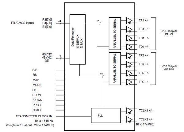 输入信号采样沿可选 - 4ch LVDS 2port (Dual Pixel Link)输出