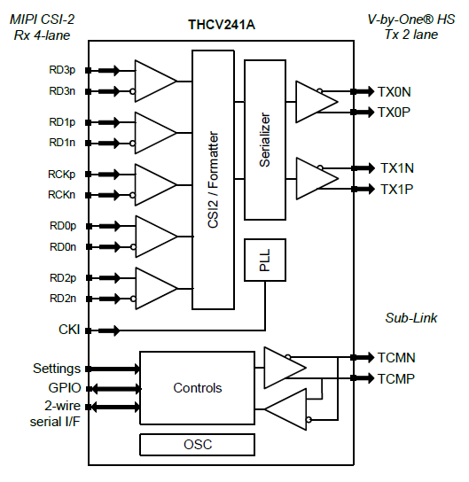 THCV243是最大4lane的可将MIPI® CSI-2影像信号转换成V-by-One® HS(千兆位・串行・接口)影像信号的传送IC,且其尺寸仅为2.1㎜x2.9㎜。拥有最大rate 4.0Gbps的V-by-One® HS输出,可仅通过1对双绞线或1根同轴线来完成1080p 60fps的摄像机的影像信号的传送。此外,还具备可桥接I2C和GPIO信号的Sub-Link功能。Sub-Link可以与V-by-One® HS用同一根线传送。