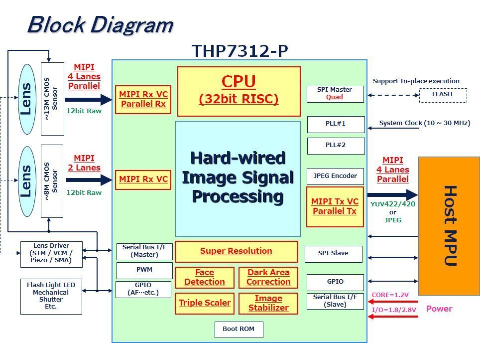 THP7312-P是一款用于摄像头的图像处理芯片。通过其由硬件构成的管线化专用引擎可以实现图像信号的快速处理,而内置的专用电路可实现高性能的3A(Auto Exposure/Auto Focus/Auto White Balance)处理。此外,通过运用本公司独立研发的以降噪技术为代表的多个图像处理模块,可以在各种CMOS Sensor上都得到最好的画质。THP7312-P还具备很多行业领先的应用功能,如:支持RGB-IR Sensor,支持Alternate row HDR Sensor,实现去雾功能等。此外,通过采用MIPI®的虚拟通道(Virtual Channel)技术可以将RGB图像与IR图像进行同时的输出。