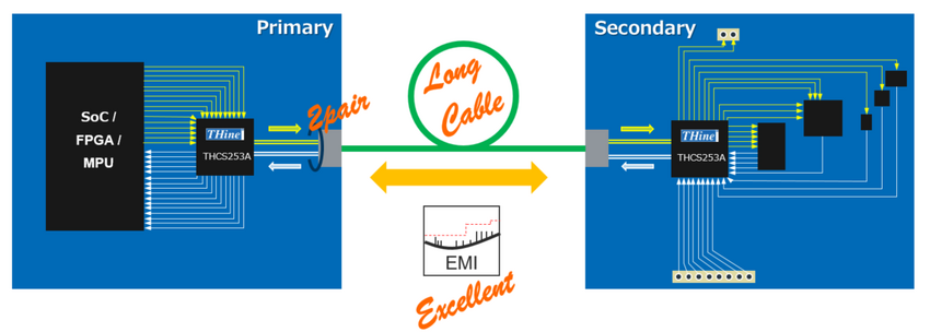 其實早在2019年底THine就能以幾乎相同方式使用serial transceiver IC「THCS251/THCS252」並將其產品化。這次的THCS253A/THCS254A是現有產品的後繼產品。它在繼承原產品基本功能的同時,又增加了重大的新變化。變化是除了集成多個 GPIO(汎用輸入/輸出)訊號線之外,還添加了一個或兩個系統的I2C。THCS253A最多有32條GPIO,THCS254A最多有20條,兩款產品均搭載1個I2C系統。此外,如果使用者進行特定設置,可以將兩個 GPIO 分配給 I2C。換句話說,最多可以將兩個 I2C 與 GPIO 束在一起進行serial傳輸。