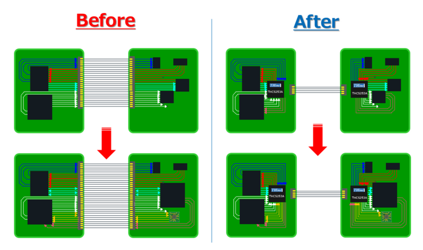 然而,與FPGA不同的是,THCS253A/THCS254A在1chip上集成了可以透過I2C定制的迴路,因此在導入時幾乎沒有增加額外的設計工作。當增加功能時,只需重寫內部register即可處理,無需重新設計訊號傳輸等硬體部分。