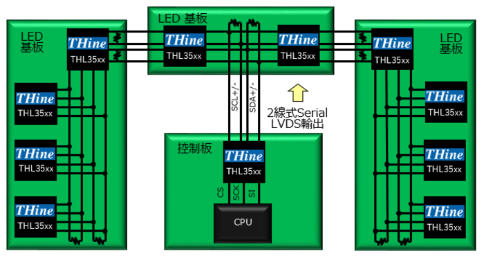 現有的THL3512/THL3514具備適合於串聯方式或多點方式Interface連接的特點。具體來說,它採用了兩對LVDS Interface(兩線式serial LVDS)。由於LVDS採用差動傳輸方式,因此在抗共模干擾方面具有較高耐性的顯著優點。