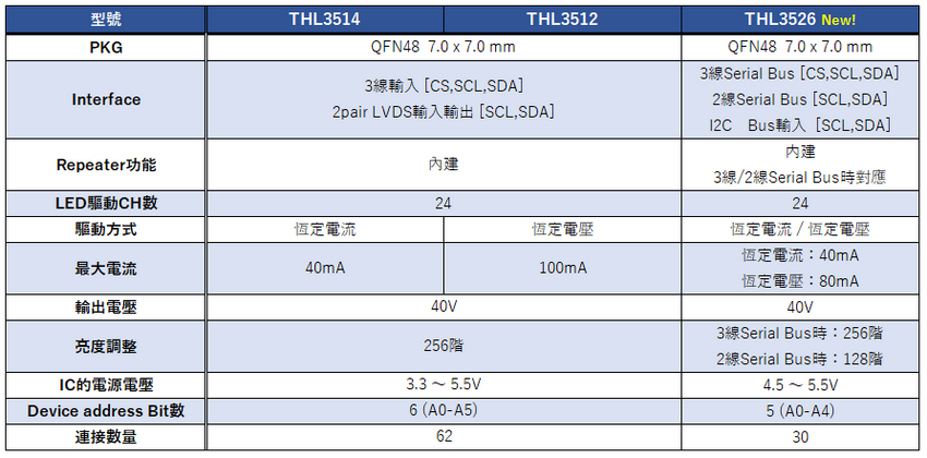 因此,我們公司為了回應這些需求,擴充了電飾用LED Driver的產品線。新推出的產品是「THL3526」(表1)。該產品不採用LVDS Interface。LED Driver之間的連接可以透過端子設定選擇3線式Serial Interface(SPI)、2線式Serial Interface(SPI)或I2C Interface。由於這些都是Single-Ended傳輸方式,因此不會增加配線數量。對於希望「避免印刷電路板上實裝面積增加」的電子設備製造商來說,這無疑是最合適的產品。