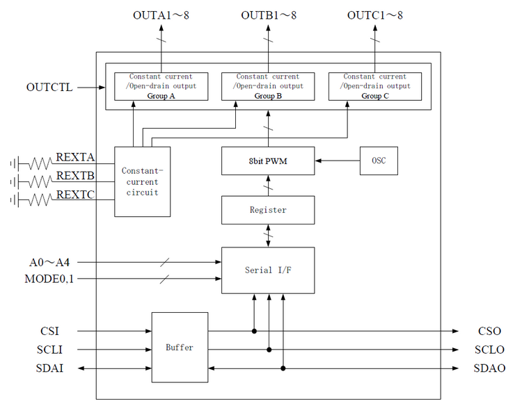 新產品的封裝為實裝面積為7mm×7mm的48pinQFN。最大驅動電流在恆定電流驅動時為40mA,在恆定電壓驅動時為80mA。亮度調整的階段數最多可達256階。電源電壓範圍為4.5V~5.5V。