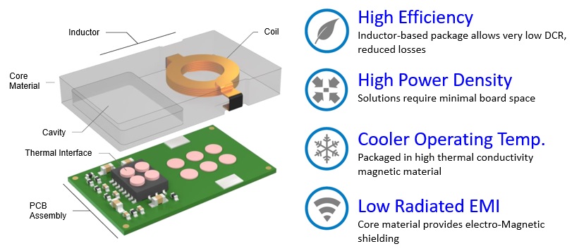 這些POL轉換器現在正加速朝向「模組化」發展。所謂模組化是指將DC-DC轉換IC、電感、電容、電阻器等封裝在同一個包裝中。因為將DC-DC轉換器迴路的元件幾乎全部包在一個模組裡,所以電子設備廠商就無需設計電流迴路,只需將模組安裝到電路板上即可。