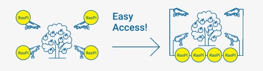 一般在果園工業物聯網系統中將機鏡頭模組以幾米的間隔安裝。也就是說,相機必須放置在各個地方,使用的相機鏡頭模組數量非常的多。如果單獨使用 Raspberry Pi的話,連接到相機鏡頭模組的Cable長度只有20cm~30cm,因此 Raspberry Pi 必須安裝在非常靠近相機鏡頭模組的位置。如此一來,在進行維修或採集影像數據時,需要到相機鏡頭模組和Raspberry Pi安裝的地方各走一圈。