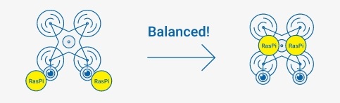 第四個關鍵字是「穩定性」(圖5)。 例如,噴灑農藥、攝影、測量和包裹遞送等等的大型無人機搭載了兩個鏡頭,這就是所謂的「Stereo camera」。考慮到大型無人機的飛行穩定性,我們想把重量約4g的相機鏡頭模組放在飛機的相對前端,將重約48g的Raspberry Pi放在飛機的中央。將重物置於中央是為了確保平衡,能夠更容易控制飛行姿勢。